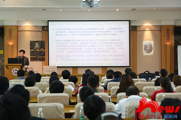 蒋洪新结合自己在马克思故居的所见所想,向大家讲述了一个平常而伟大的共产主义者马克思的一生。在谈及马克思一生的学术发展时,他说,我们应当学习马克思对理想的坚定,择业时也要学习马克思选择最能为人类福利而劳动的职业。在谈及马克思与恩格斯的友谊时,他说,当今学术研究更重要的是合作,他鼓励大家在大学进行广泛的学习。蒋洪新说,正是因为恩格斯深入英国工人群众之中,才写出了如此深刻的调研报告,这对于我们开展党的群众路线教育实践活动具有重要的指导意义。