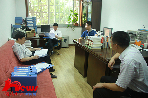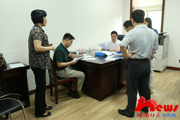 去二级单位督查前,督导组在徐书华、党委组织部部长周劲松、党校常务副校长袁稻香陪同下,在学校活动办文秘组办公室查阅了相关材料。