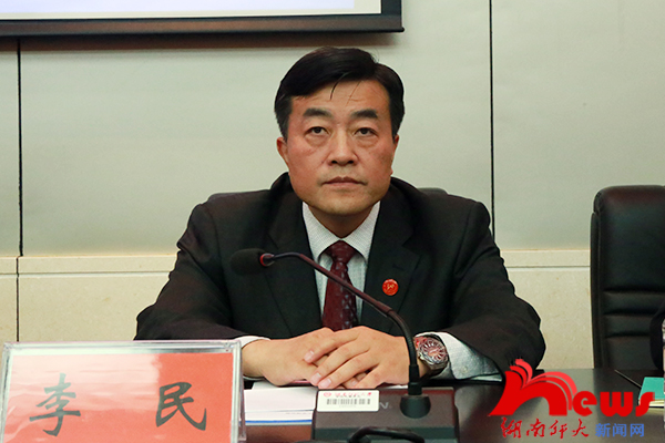 李民代表学校对对各位领导、学员的到来表示热烈欢迎。他简要介绍了我校的办学历史、办学规模和办学成就。李民说,省委组织部将此次干部培训班继续设置在我校,体现了对我校人文底蕴和学科特色的看重,也是对我校的信任。在前两期办班的基础上,我校党委组织部和党校围绕“发掘湖湘文化精髓,提升干部人文素养”这个主题,精心选择授课课程,精心挑选授课教师,所选的9门课程涉及文学、哲学、历史学、法学、管理学、教育学、心理学等多门人文社会科学,跟去年相比课程内容更新率达到56%;主讲的教师都是在一定领域内学有所长、享有盛誉的专家教授。李民表示,学校将按照省委组织部的要求,举全校之力,抓好管理,做好服务,确保培训班各项工作顺利开展。