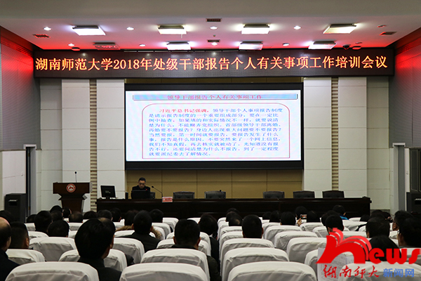 (供稿 党委组织部 记者 符嘉懿 彭鹤鸣)1月24日上午,我校2018年处级干部报告个人有关事项工作培训会议在至善讲堂召开。省委组织部干部监督处副处长雷忠胜为学校处级干部个人有关事项填报对象近180人作了辅导报告,培训会由校党委副书记刘起军主持。