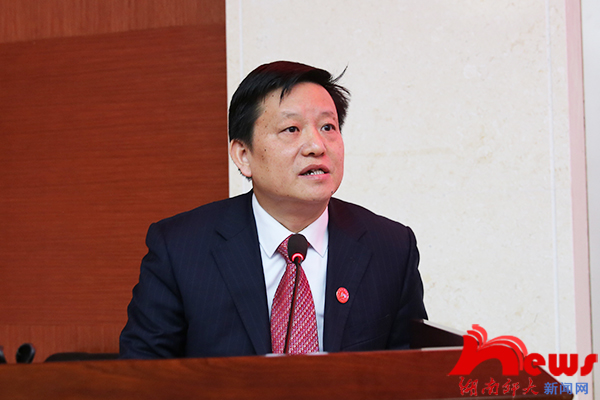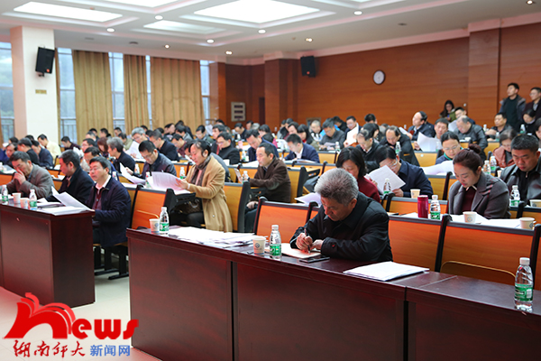李民代表学校党委领导班子汇报2017年度工作并作个人述职。他从全面加强党的建设,牢牢掌握党对高校工作的领导权;全面落实立德树人根本任务,不断推进思想政治工作改革创新;全面推进内涵式发展,学校各项事业取得新进展等方面对学校2017年工作进行了汇报,并从四个方面作了个人述职:一是2017年的主要工作。深入学习习近平新时代中国特色社会主义思想,切实强化理论武装;落实新发展理念,推动学校工作主动服务湖南创新引领开放崛起战略;履行管党治党责任,不断推进党建工作科学化水平;注重防范化解重大风险,脱贫治污紧抓不放;重视校园安全,强化综合治理工作;认真履行基层党建工作责任制,“两学一做”常态化制度化初步形成。二是努力做勤政廉洁表率,做到勤勉敬业,廉洁自律。三是几点工作体会。他表示,要坚定理想信念,坚持党要管党不放松;要狠抓关键少数,身先士卒带头加油干;要加强党建思政,深化改革推进大发展;要狠抓从严治党,风清气正执纪要更严。四是存在的不足及今后努力方向。他指出,今后将进一步提升理想信念教育成效、加强干部队伍管理力度、严格从严治党制度执行。