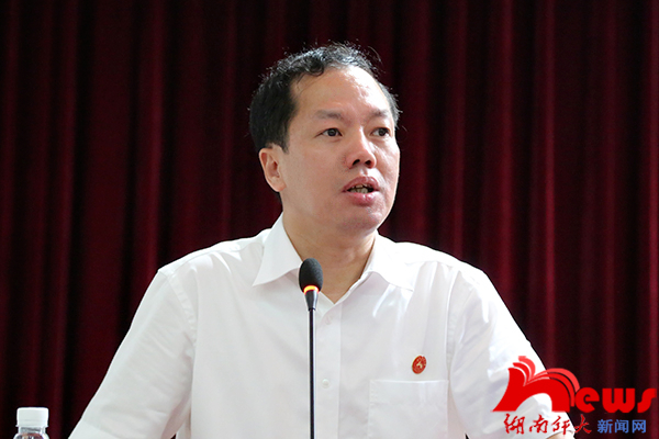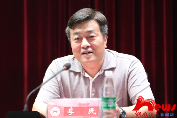 李民作《狠抓巡视整改强化科学治理》主题报告。他表示,要提高政治站位,重视巡视整改;突出问题导向,把握整改关键;坚持真抓真改,强化科学治理。他简要介绍了习近平总书记听取十九届中央第一轮巡视情况汇报时的重要讲话精神、习近平总书记对湖南工作重要讲话指示精神、中央第八巡视组巡视湖南省情况反馈会议精神、省委第八巡视组巡视我校情况反馈会议精神、学校党委巡视整改工作开展情况等,并就政治巡视、党的全面领导、党的建设、全面从严治党、意识形态工作等相关内容进行了阐述和强调。他具体介绍了通过巡视发现的管理问题和当前干部队伍建设导向,他指出,闻过则喜,卧薪尝胆,要用大学习推动学校治理能力和治理水平大提升,要着力增强适应新时代发展要求的本领能力,抓好干部队伍建设“六度”:理想信念的高度、考核评价的准度、责任压实的力度、严格要求的刚度、组织关怀的温度、创业奋斗的效度。李民还和大家分享了习近平总书记推崇的优秀先进典型,勉励大家以祖国富强、民族振兴、人民幸福为己任,不负韶华、持续奋斗。