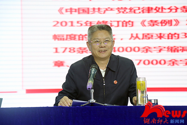 唐贤清运用丰富的案例,从“修订的背景”“修订的7个要点”以及“重要修订点”三个方面对新修订的《中国共产党纪律处分条例》进行解读。他指出,1997年至今,《中国共产党纪律处分条例》共经过四次改版,此次改版新增条例11条,修改65条,整合2条,总结吸收了党的十八大以来党的建设特别是全面从严治党的重要理论、实践和制度创新成果,使用了许多新表述,规范了一些新型违纪行为及其处分种类和幅度,体现了纪律建设的政治性、时代性和针对性,向全党释放了全面从严治党永远在路上的强烈信号。他强调,广大党员要进一步增强纪律和规矩意识,真正做到守纪律、讲规矩。