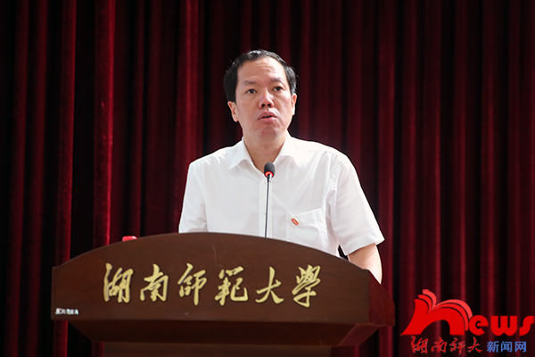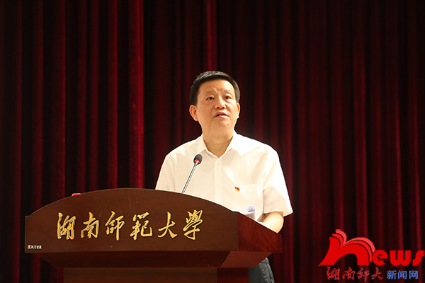 蒋洪新全面回顾了新中国新湖南以及我校70年来取得的辉煌成就。他说,新中国成立以来的70年,是新中国经济实力和综合国力大幅跃升、人民生活水平极大改善、社会文明程度显著提升、国际地位空前提高的70年。70年来,特别是党的十八大以来,湖南省实现了从贫困落后到全面小康的跨越、从百废待兴到百业兴旺的跨越、从内陆封闭到创新开放的跨越、从温饱不足到人民幸福的跨越。他表示,70年来,湖湘大地发生的深刻变化,生动印证了伟大祖国从站起来、富起来到强起来的历史跨越,生动彰显了中国共产党的领导和中国特色社会主义制度的政治优势。他指出,中国道路是成功密码、科学理论是行动指南、改革开放是关键一招、人民群众是力量源泉、党的领导是根本保证,这五条经验是新中国新湖南70年发展进步的内在逻辑。