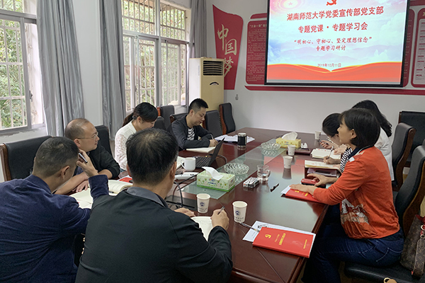 (通讯员 颜星)10月11日下午,党委宣传部党支部在宣传部会议室举行“不忘初心、牢记使命”主题教育专题学习研讨会。校党委委员、宣传部部长晏昱主讲《不忘初心 牢记使命——深入学习贯彻<中国共产党宣传工作条例>》专题党课,全体党员围绕“明初心、守初心、坚定理想信念”展开交流讨论。